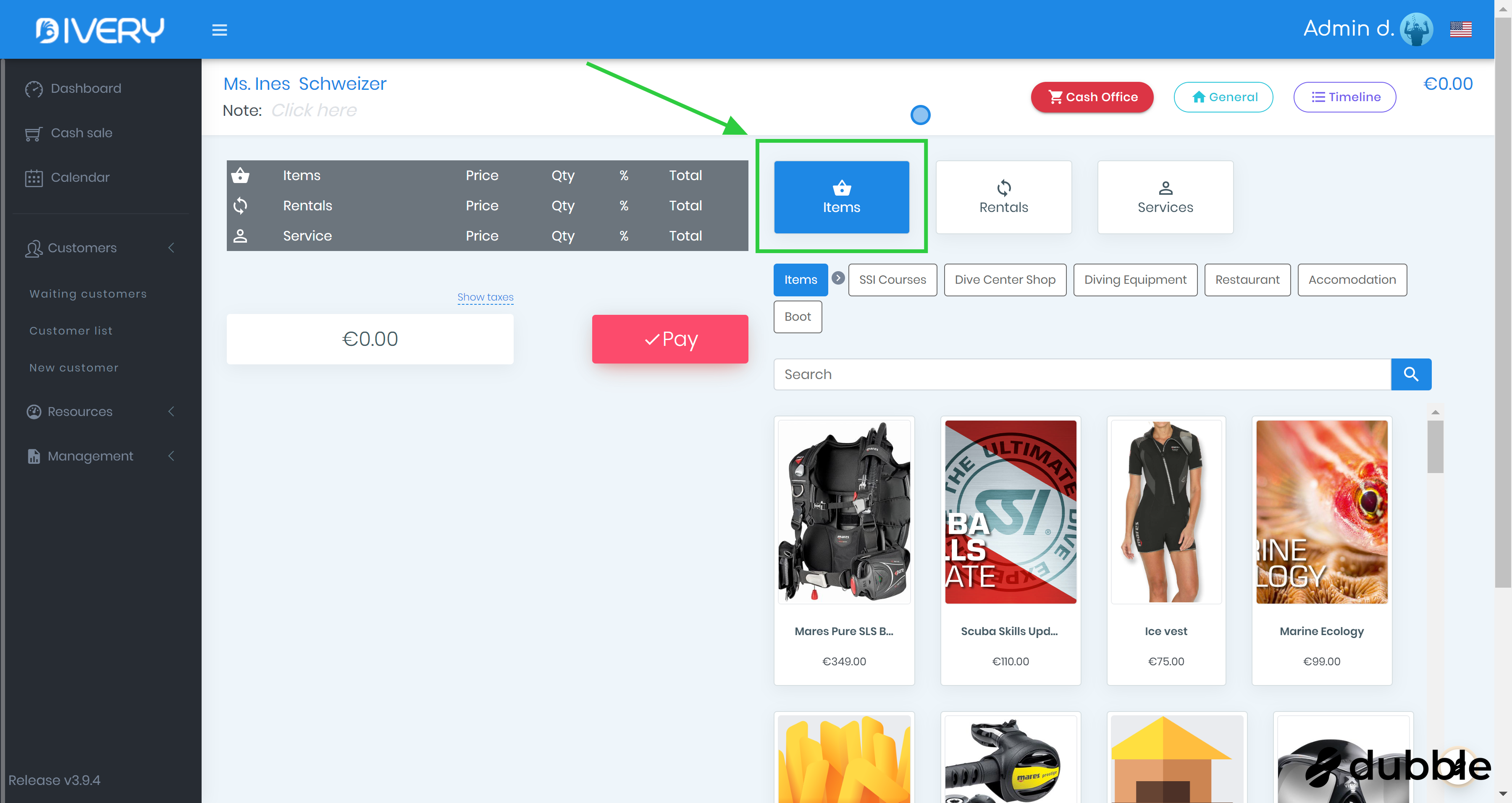An overview of the different categories in the shopping cart and how to quickly search for an item, rental or service. 1. Go to the cash office of a customer Click on a customer's name and open the cash office by clicking the button " CASH OFFICE ". ...