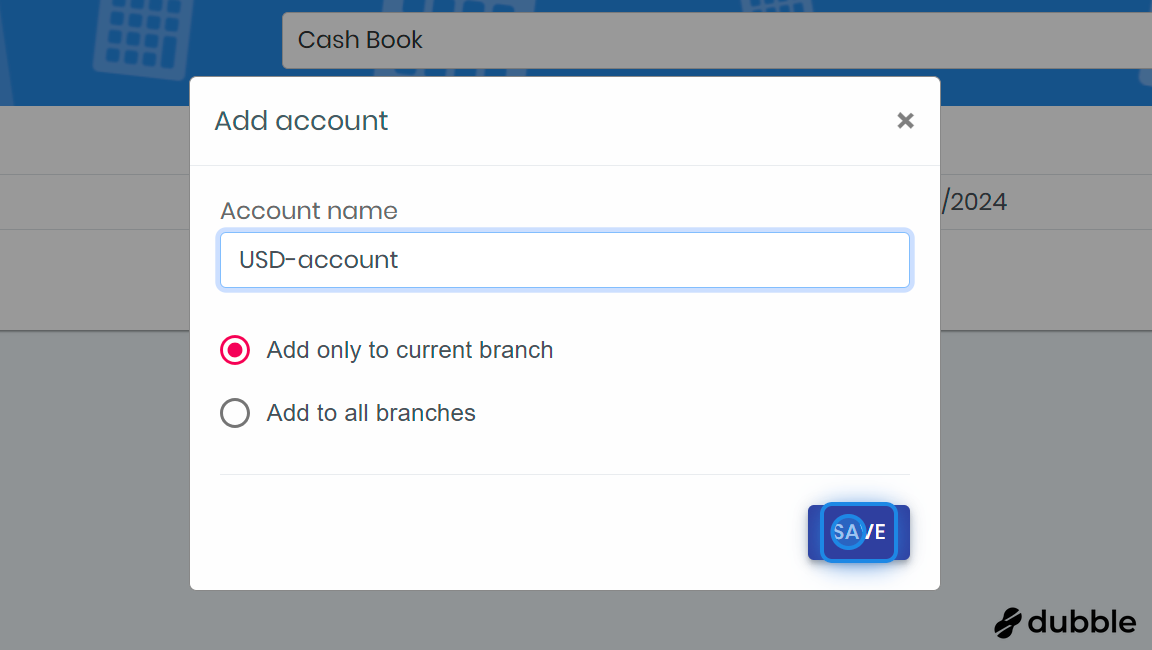 Give the new account a name. Then select if this account is accessible only in this branch or in all branches.