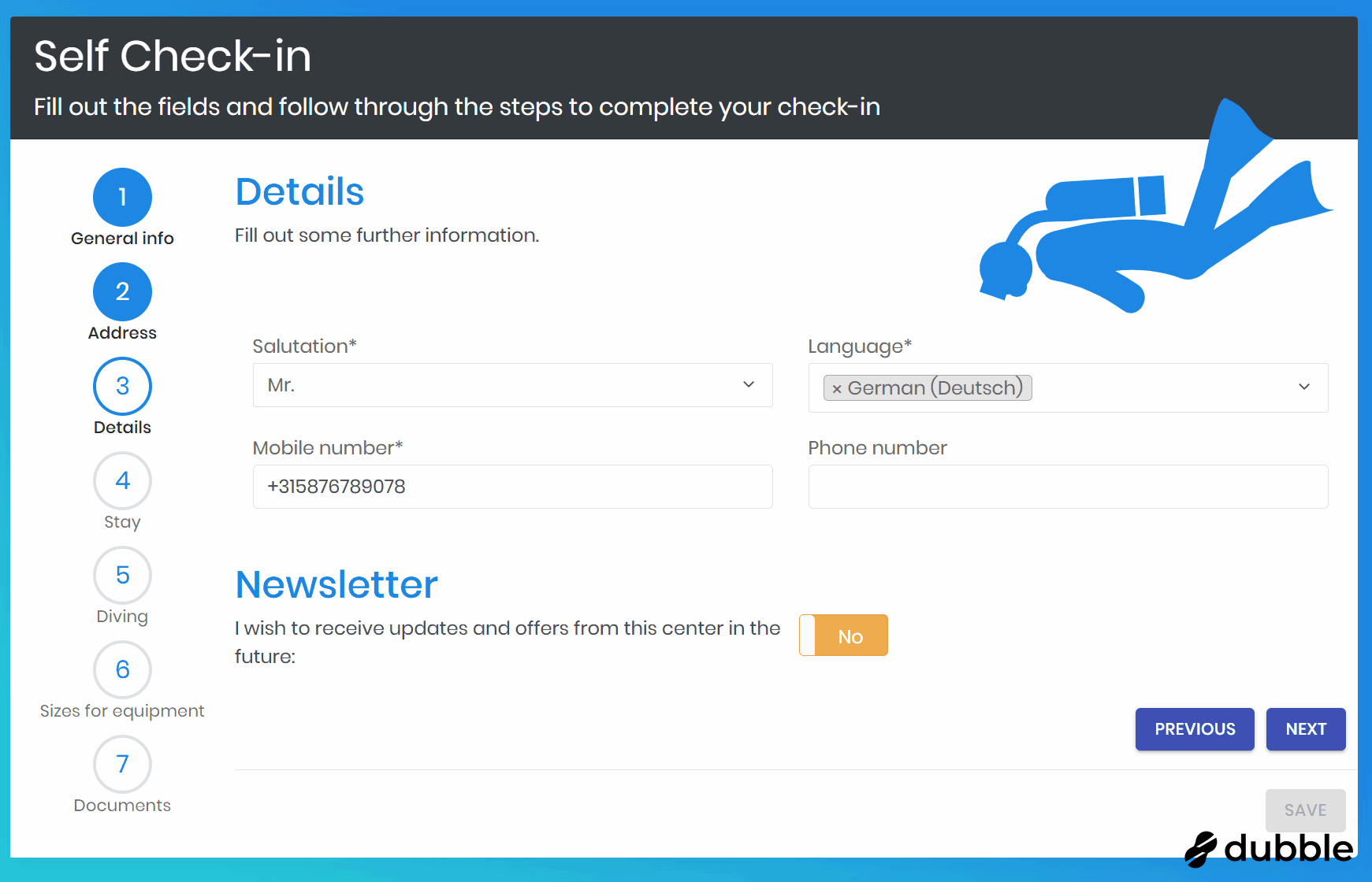 A customer can sign up for the newsletter during the self-check-in process by clicking "Yes" for the newsletter.