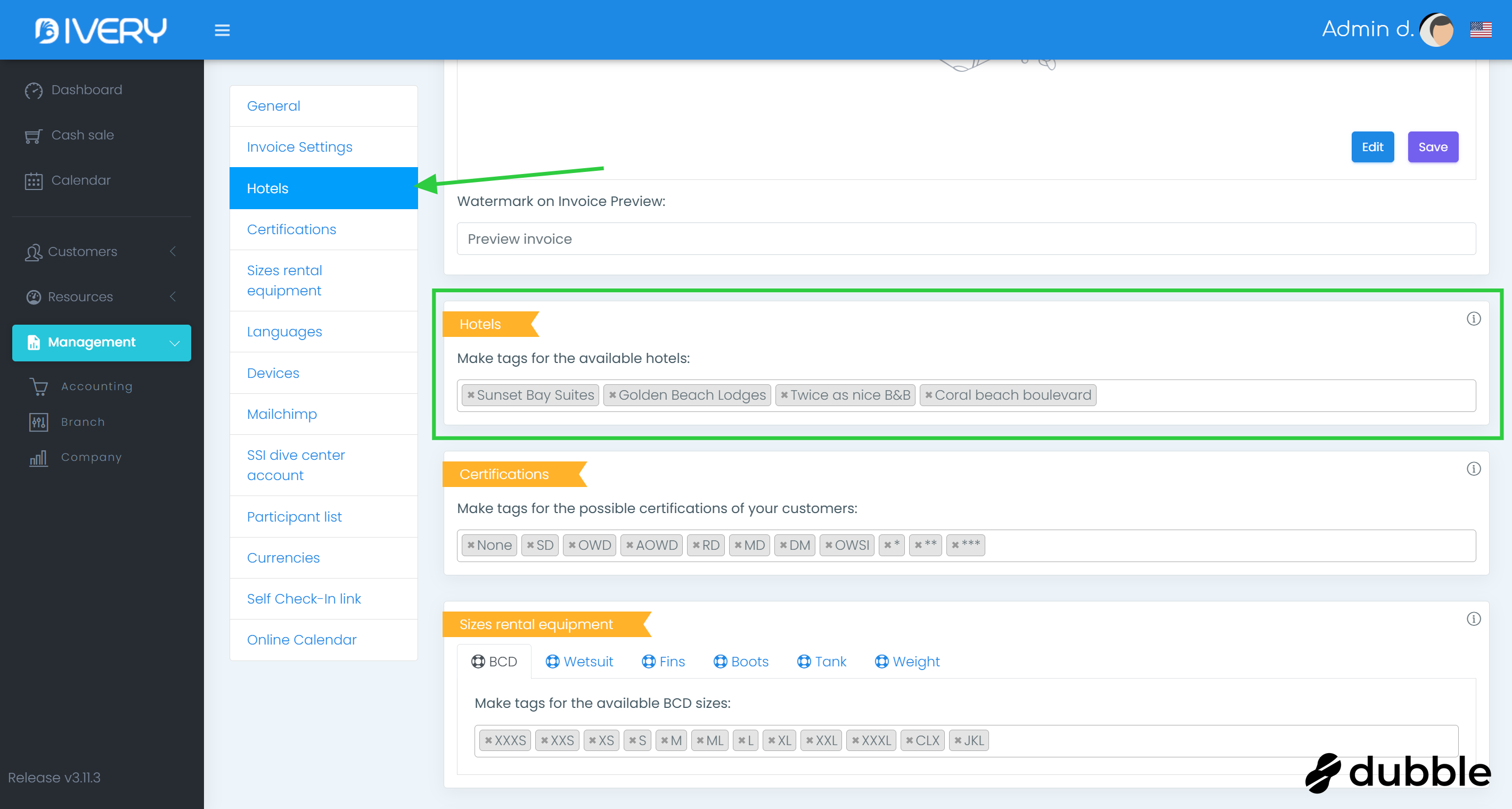 Here, you can create all the certifications needed at your center. If you prefer, you can name the certifications general or specific to each dive organization. 1. Go to the branch settings You can find the branch settings under the management tab. ...