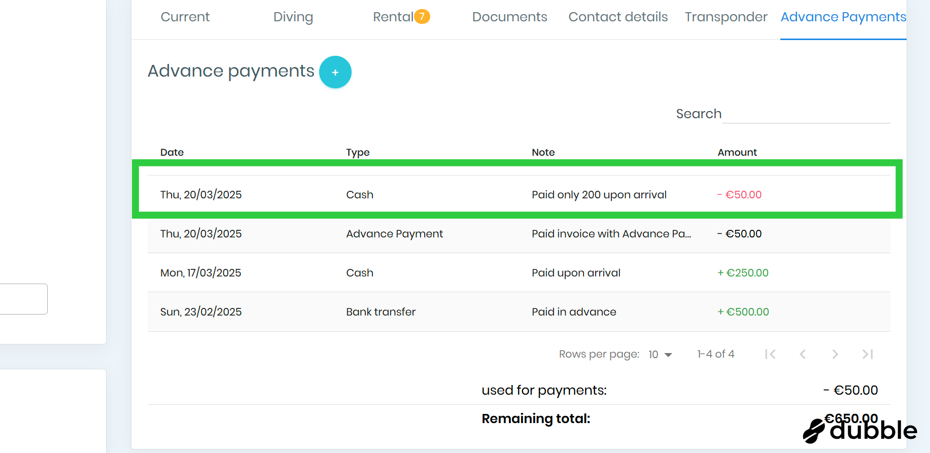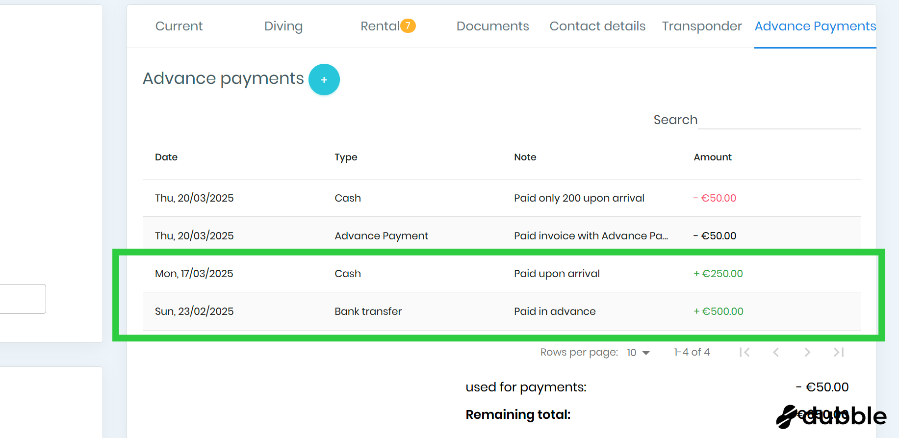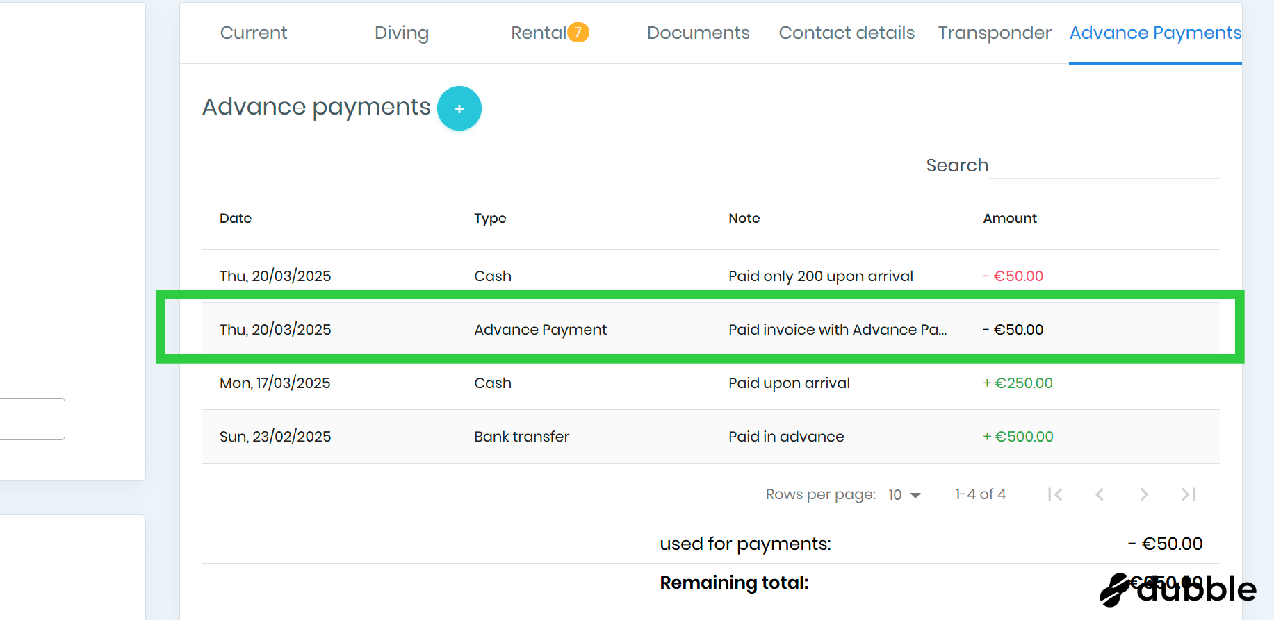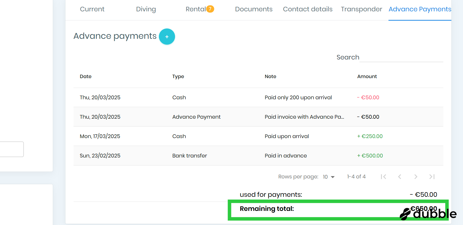 Here, you can see the remaining balance of the customer's advance payments. This amount is available in the shopping cart when paying an invoice.