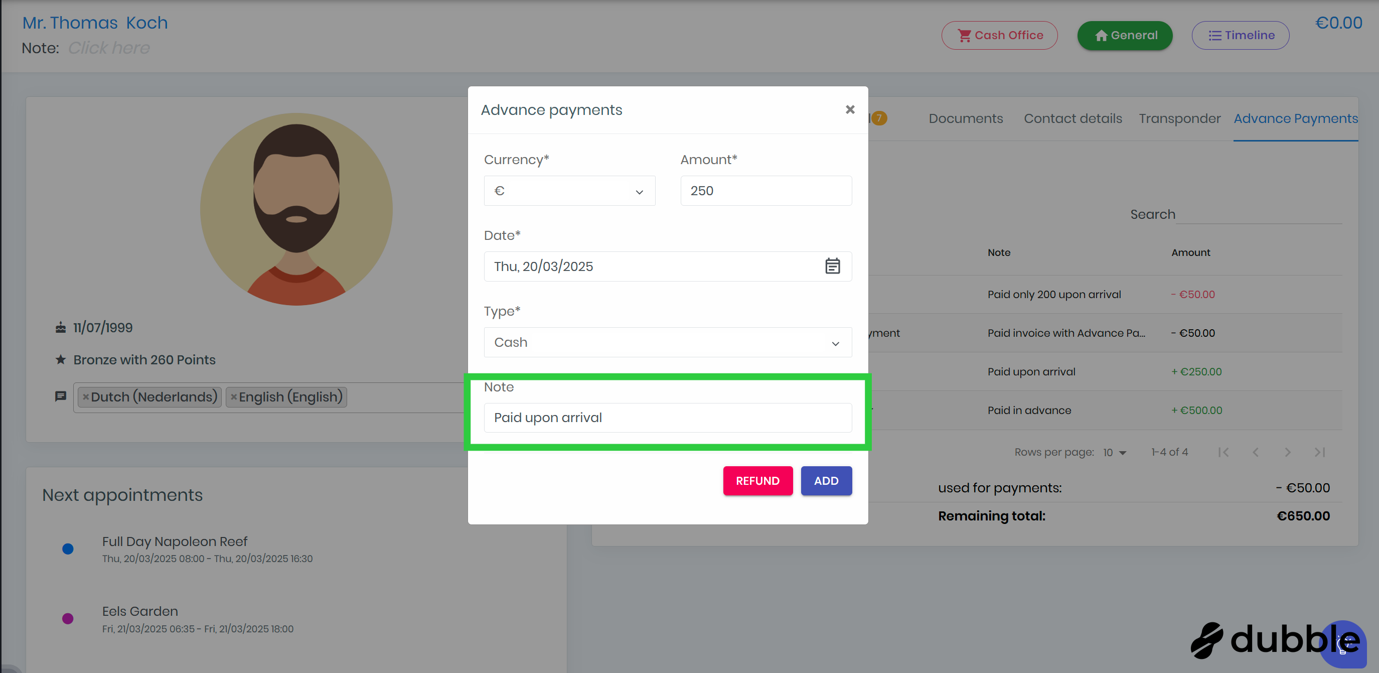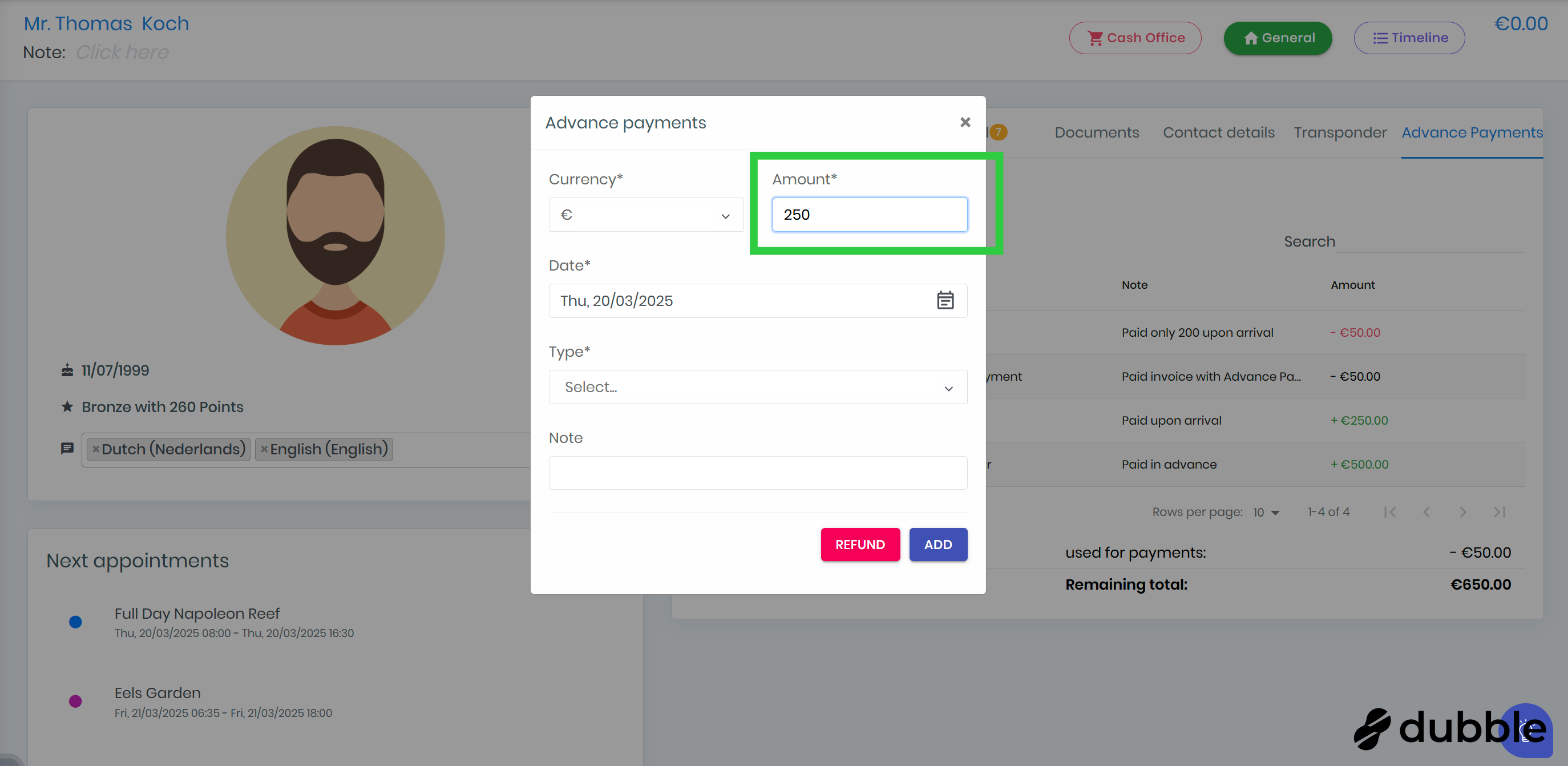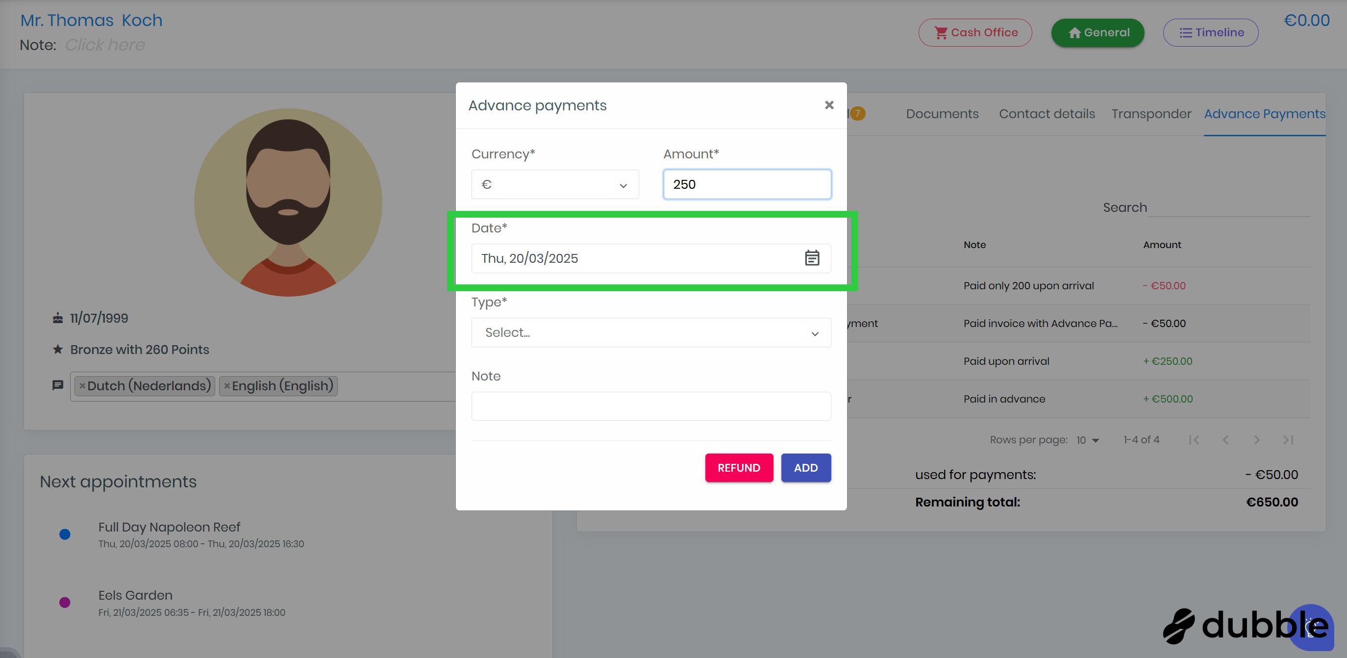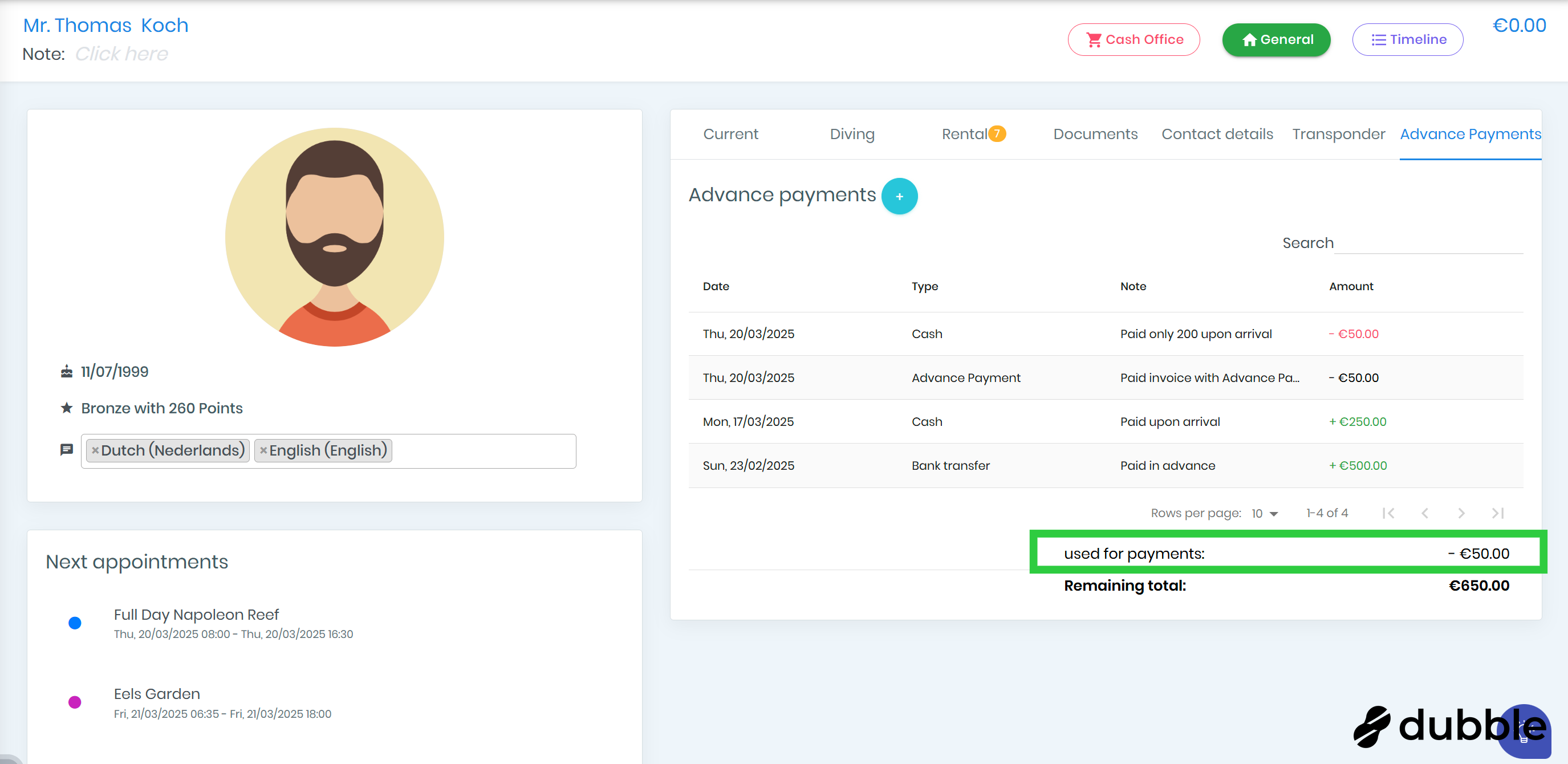 Here, you can see the remaining balance of the customer's advance payments. This amount is available in the shopping cart when paying an invoice.