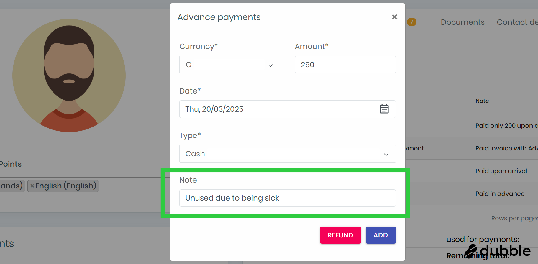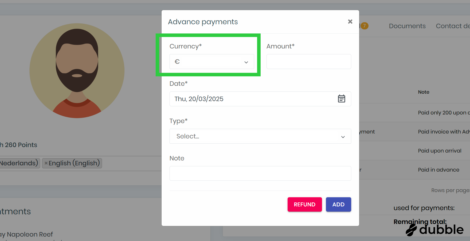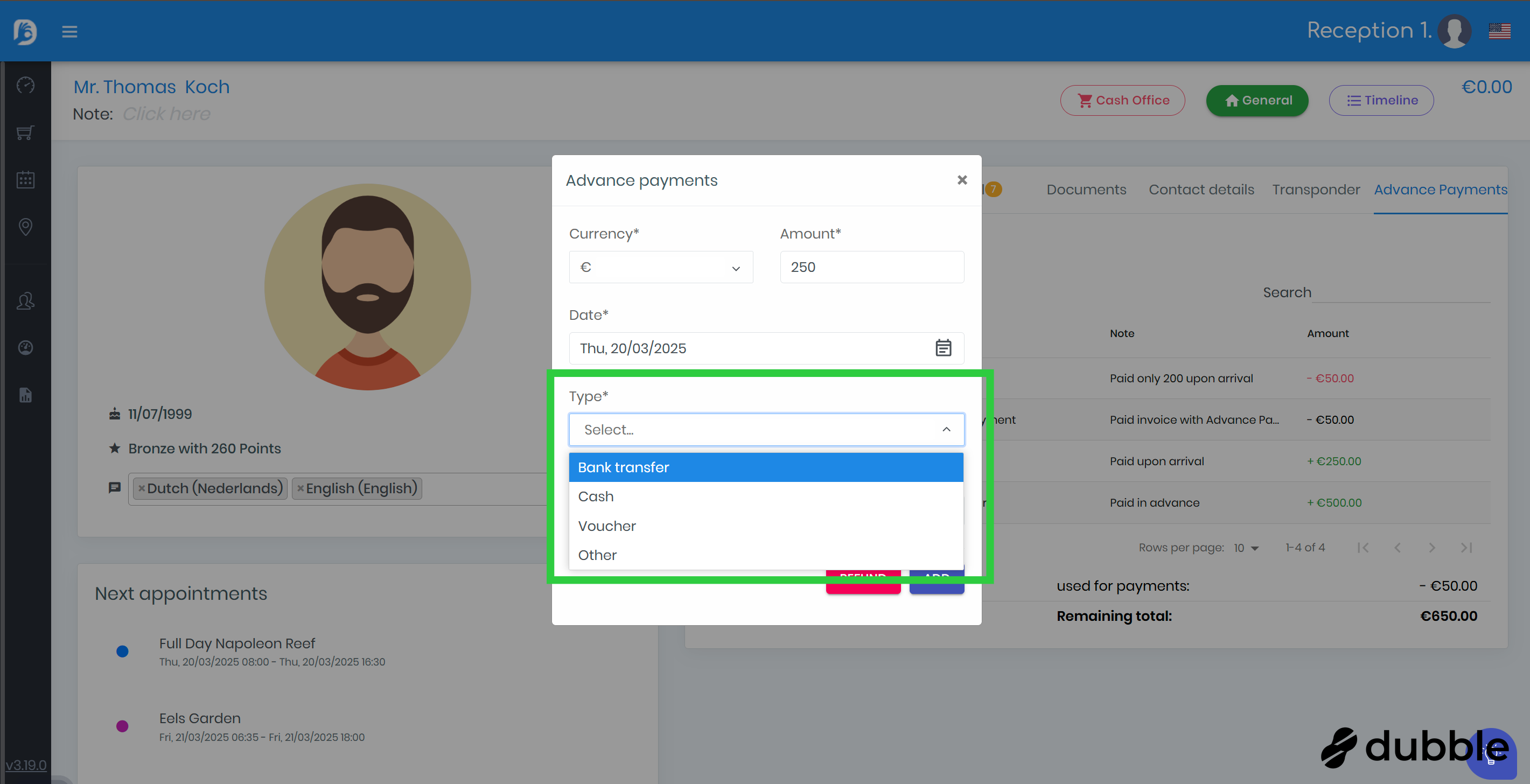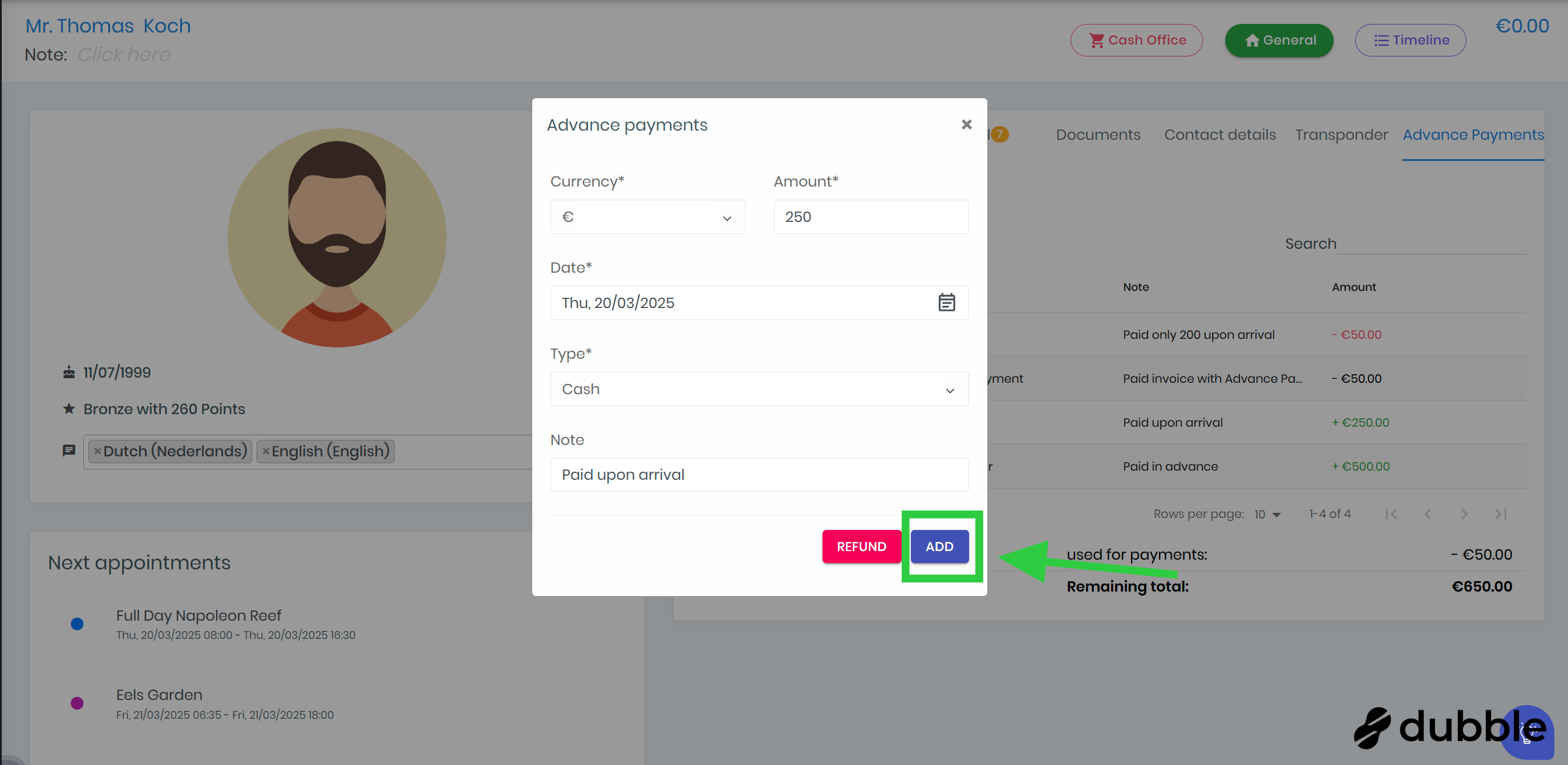 Here, you can see the remaining balance of the customer's advance payments. This amount is available in the shopping cart when paying an invoice.