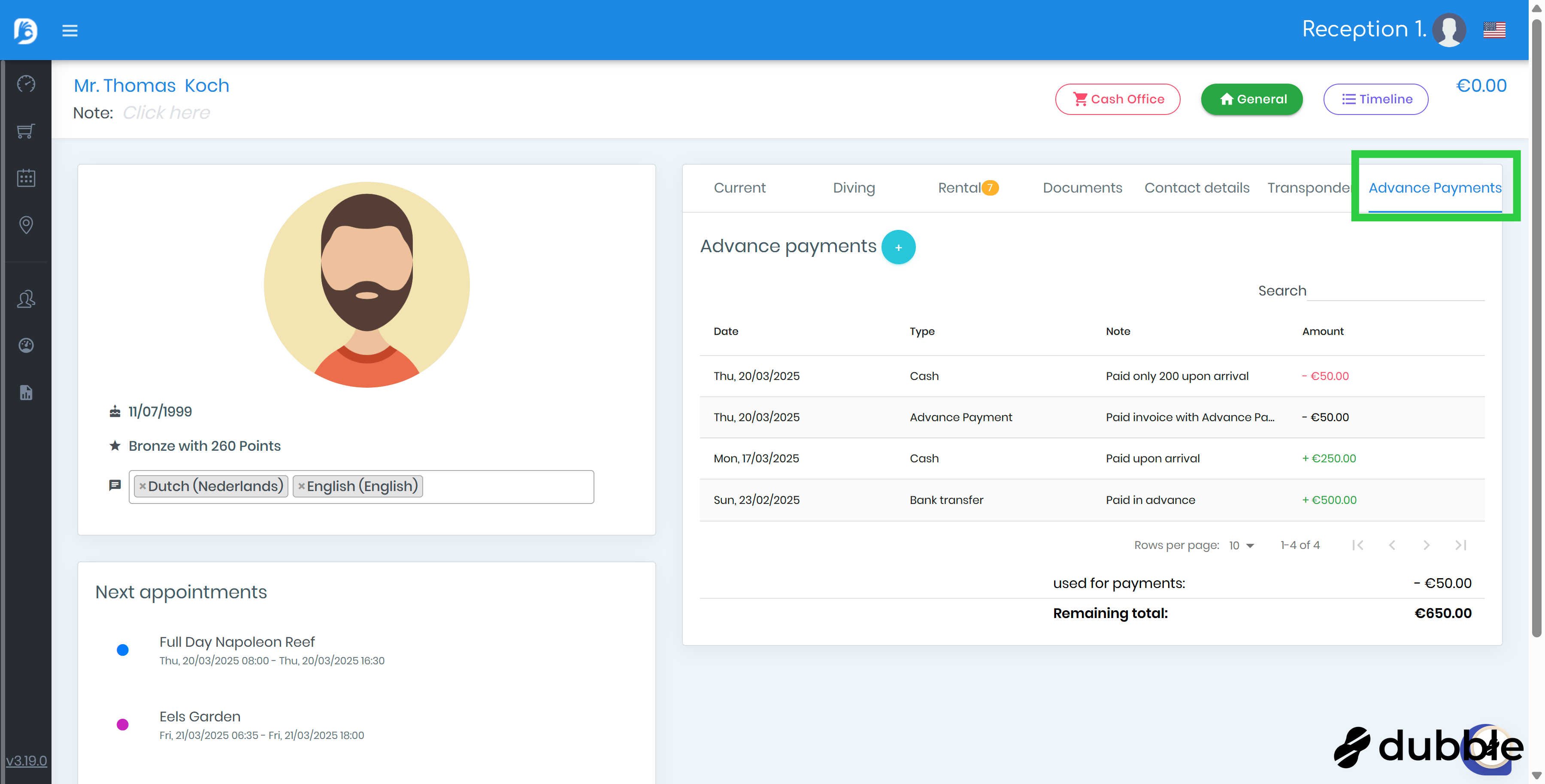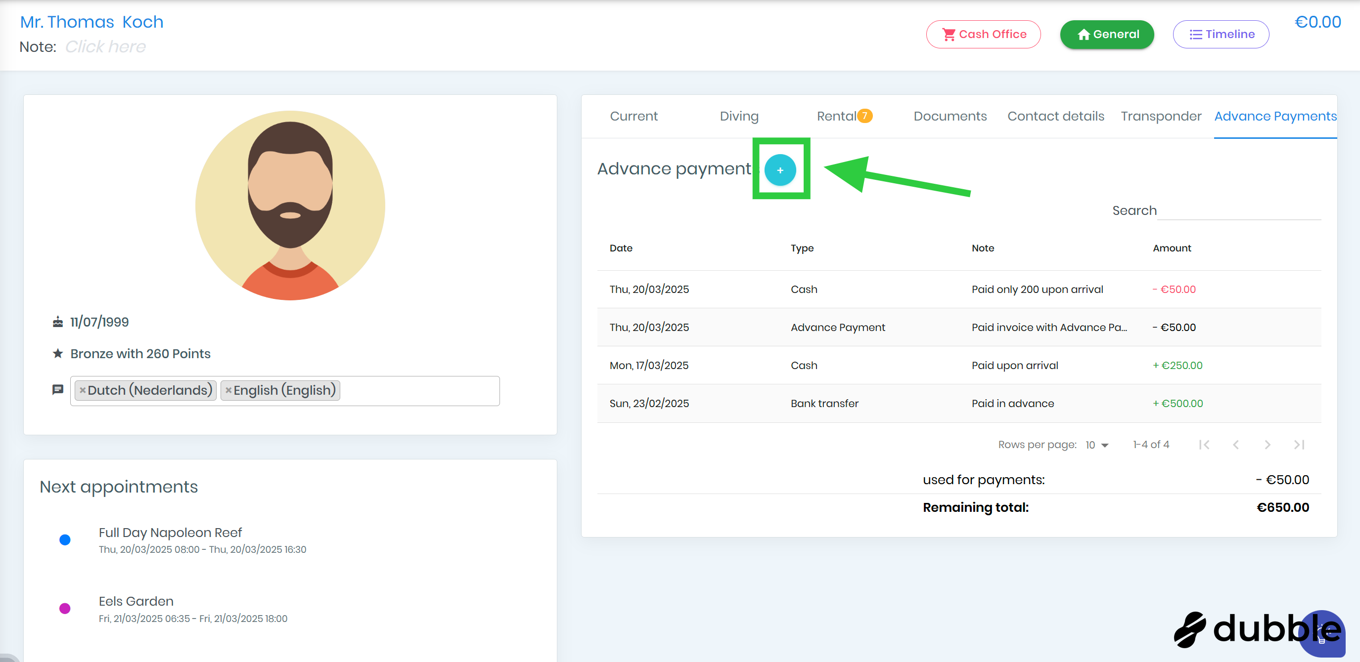 Here is an overview of the second tab "diving" of the customer dashboard. 1. Click on a customer Click on a customer in the center dashboard. Alternatively, you can search for a customer or go to the customer list and select one there. 2. Click on ...
