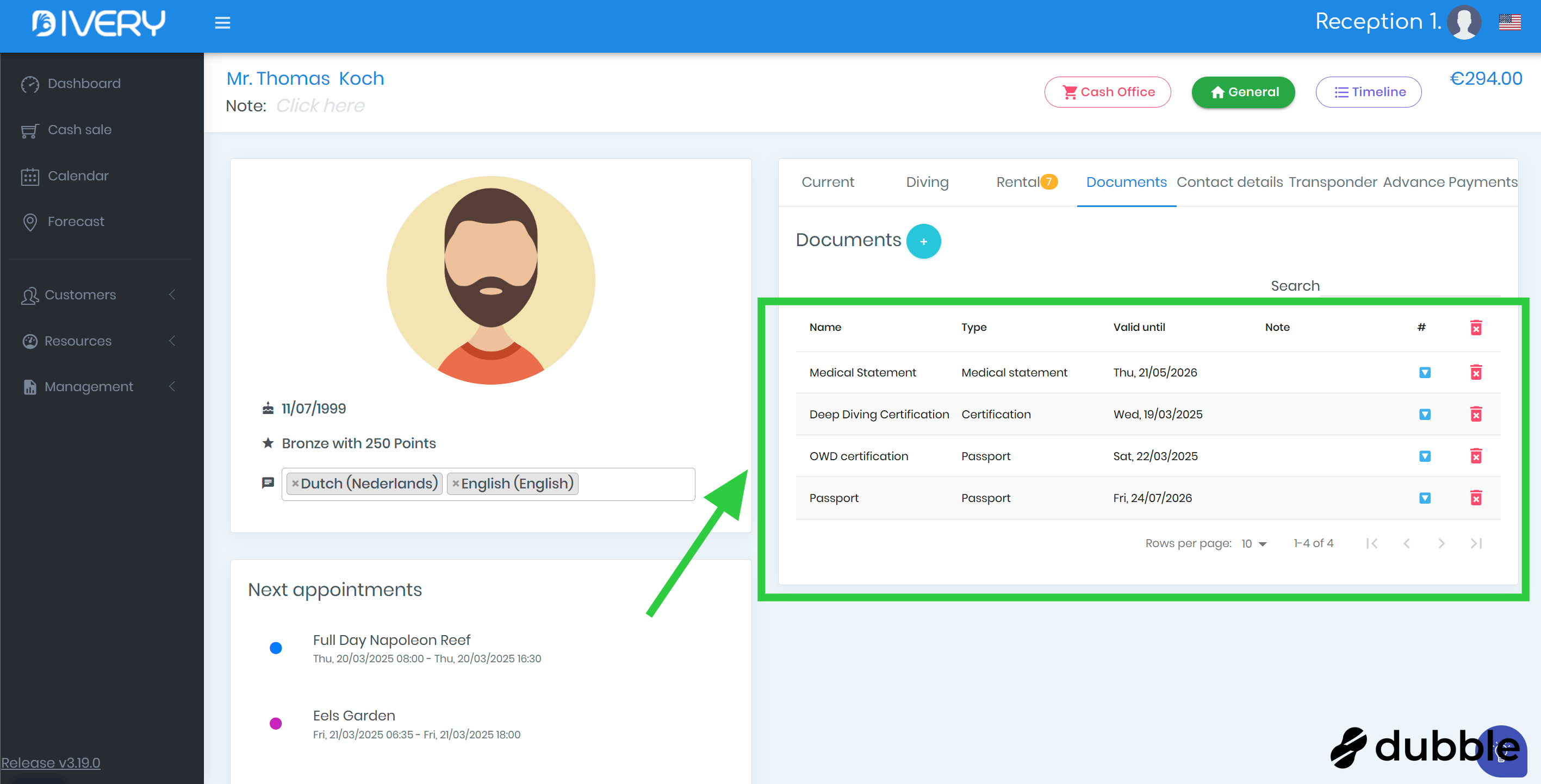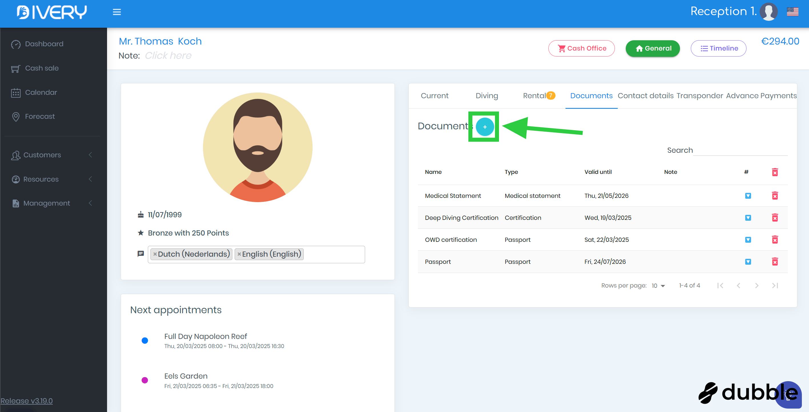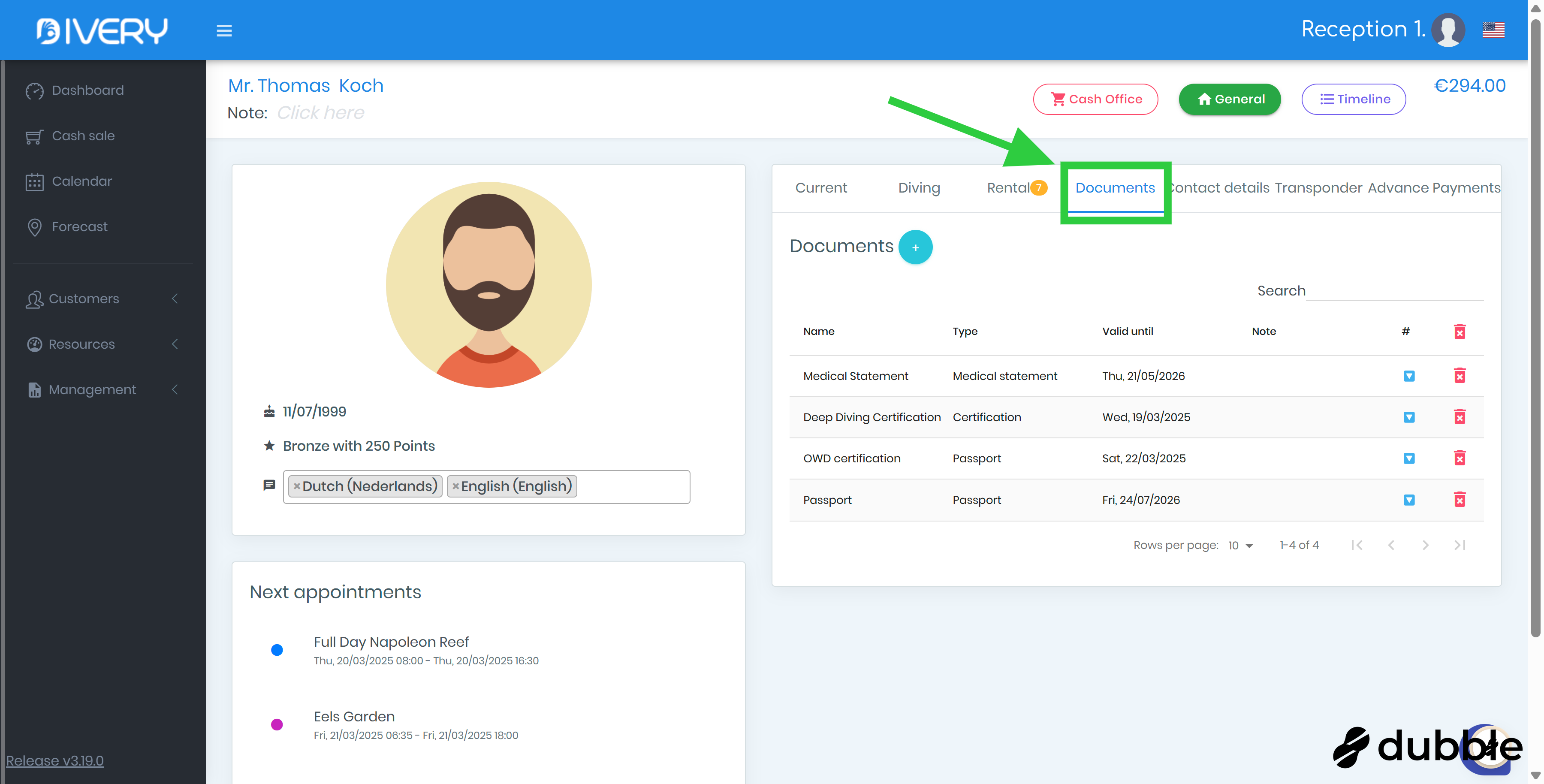 Here is an overview of the second tab "diving" of the customer dashboard. 1. Click on a customer Click on a customer in the center dashboard. Alternatively, you can search for a customer or go to the customer list and select one there. 2. Click on ...