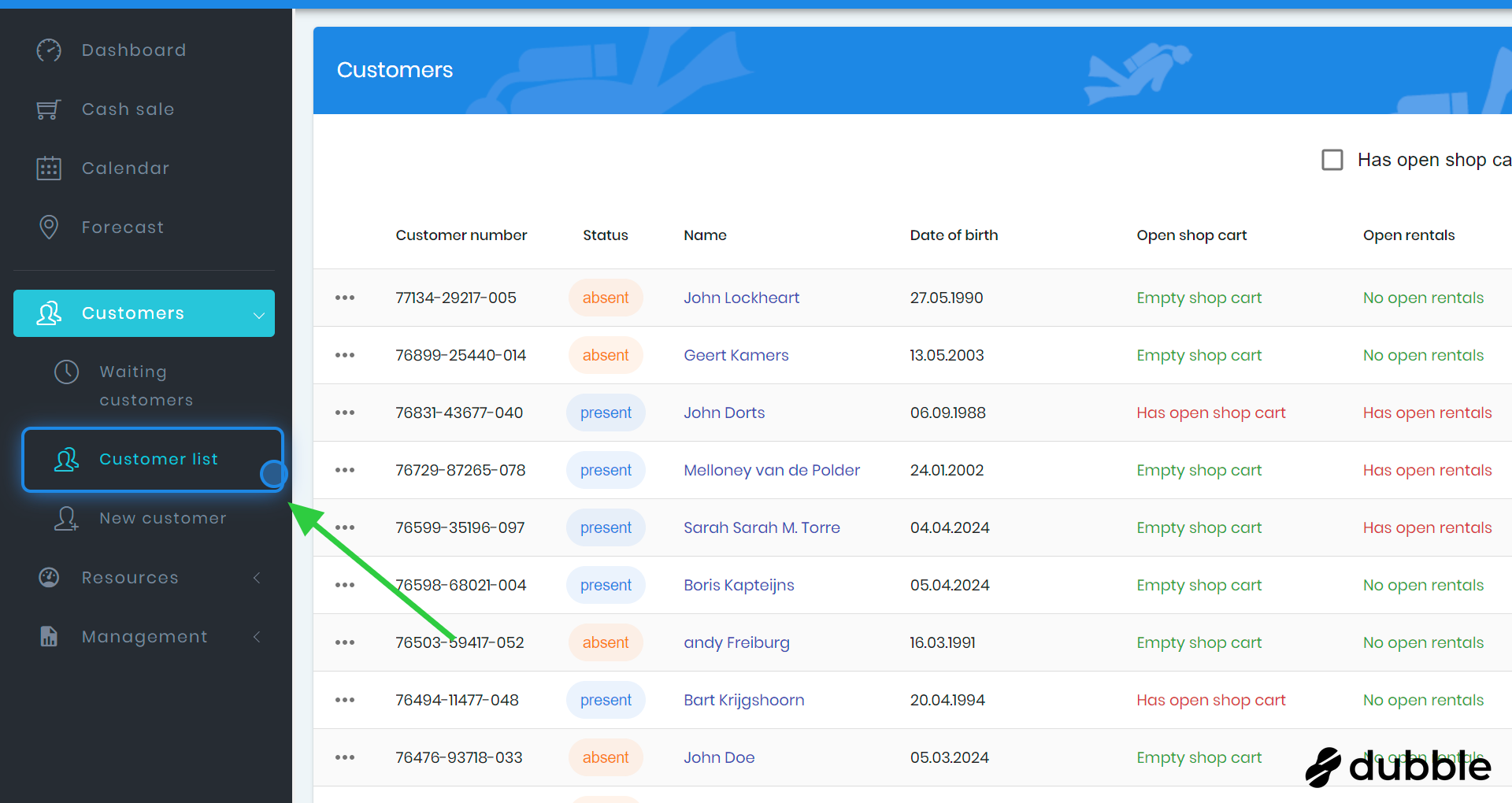 Open the sidebar menu and click on the " Customer list " button. When the page has finished loading you will see a table with all customers you have saved.