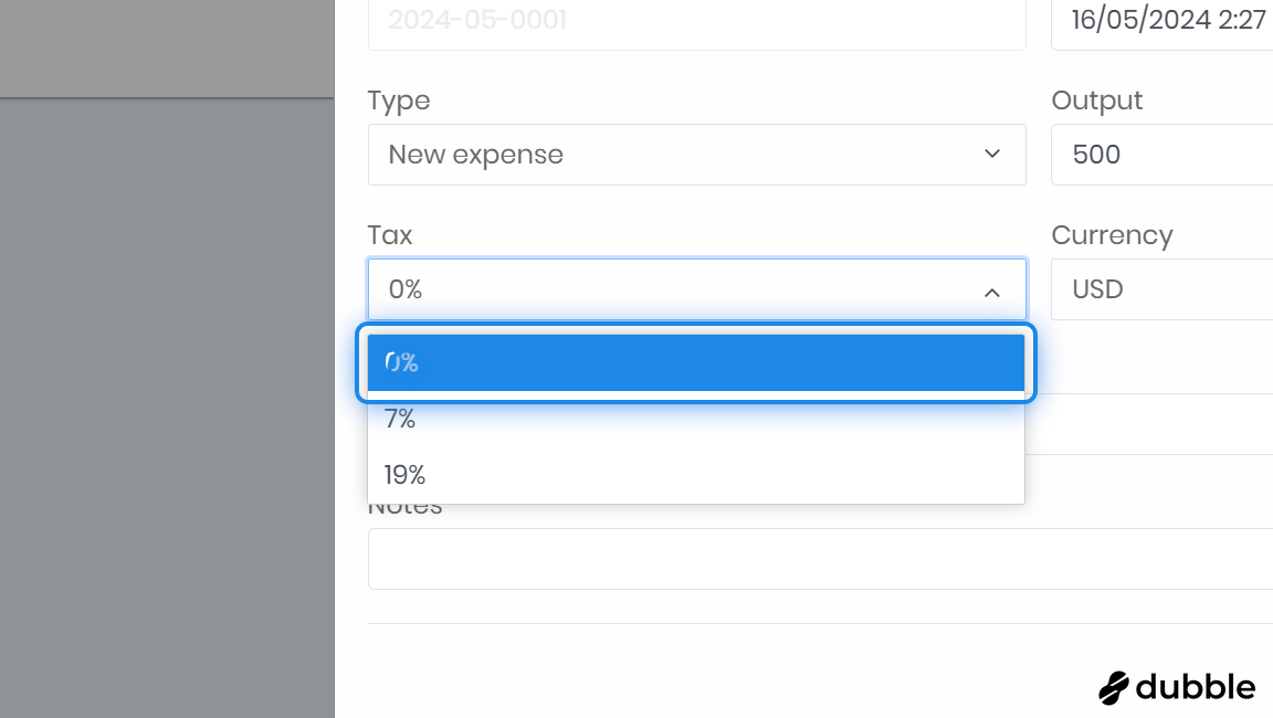 Here you can select the tax amount from the dropdown menu. If taxes are not applicable, you can keep 0% selected.