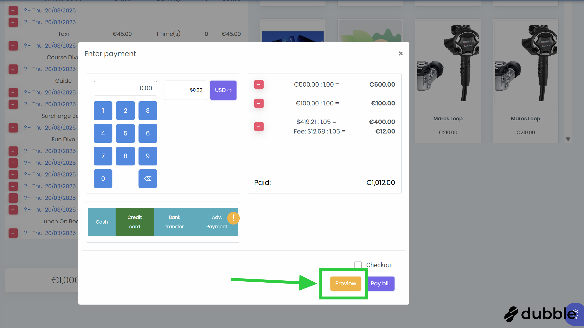 You can click on the "Preview" button to get a preview of the invoice. This can be used to show the customer the invoice before confirming the payment.