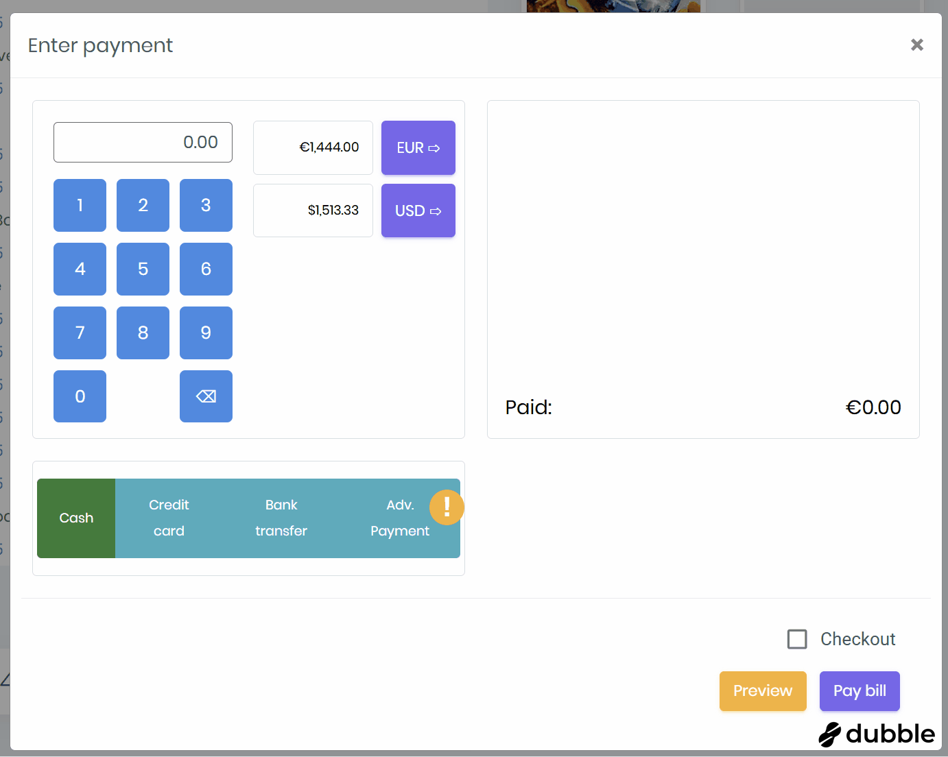 Example: a customer can use a combination of advance payment, cash in EUR, cash in USD, and a credit card to pay the same invoice.
