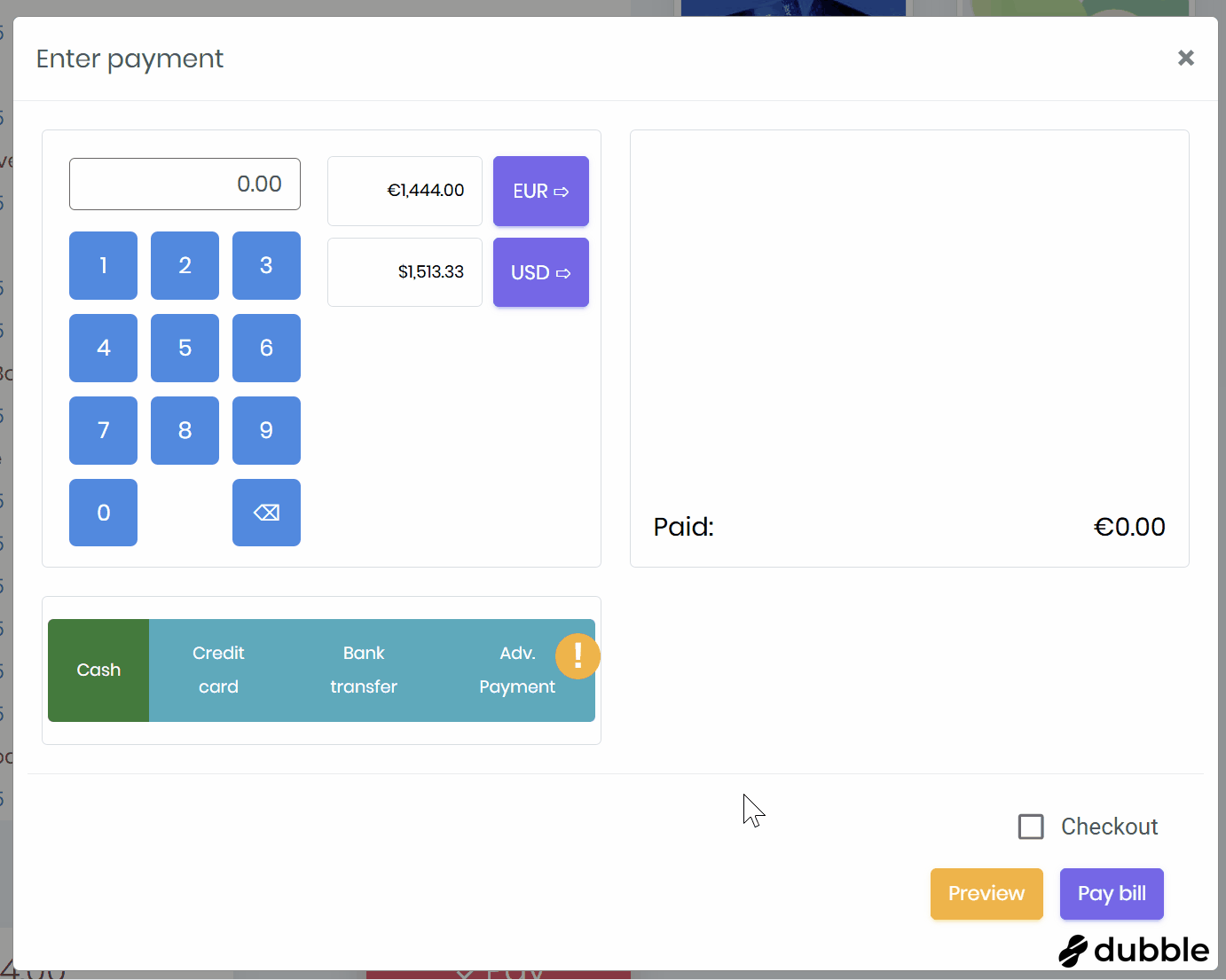 Example: a customer can use a combination of advance payment, cash in EUR, cash in USD, and a credit card to pay the same invoice.
