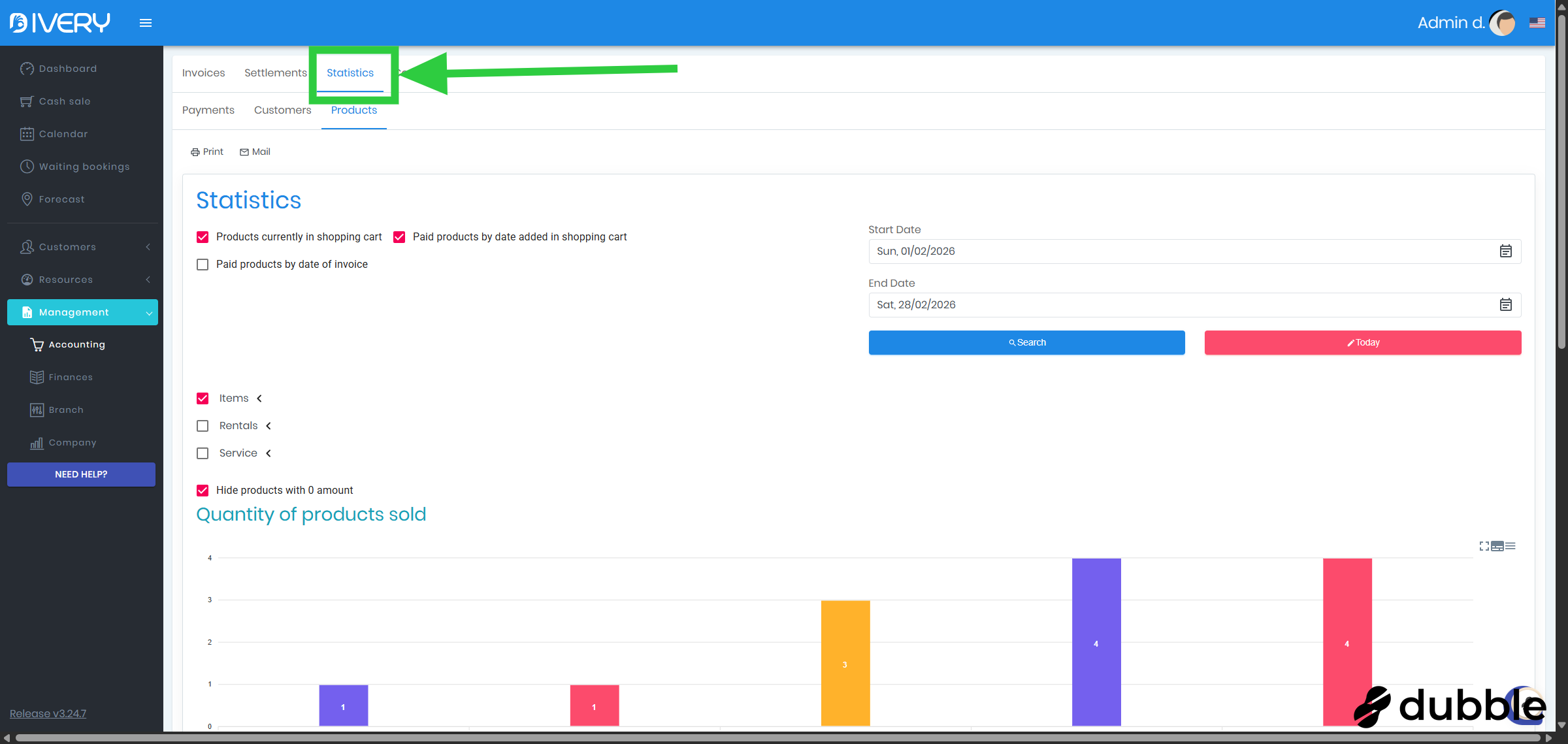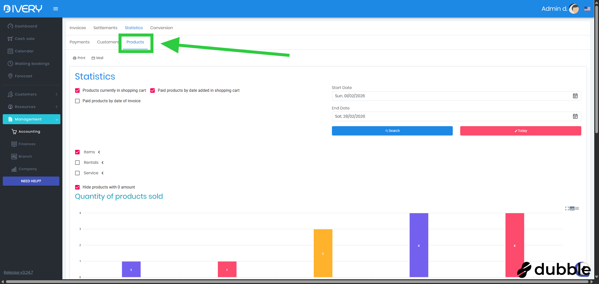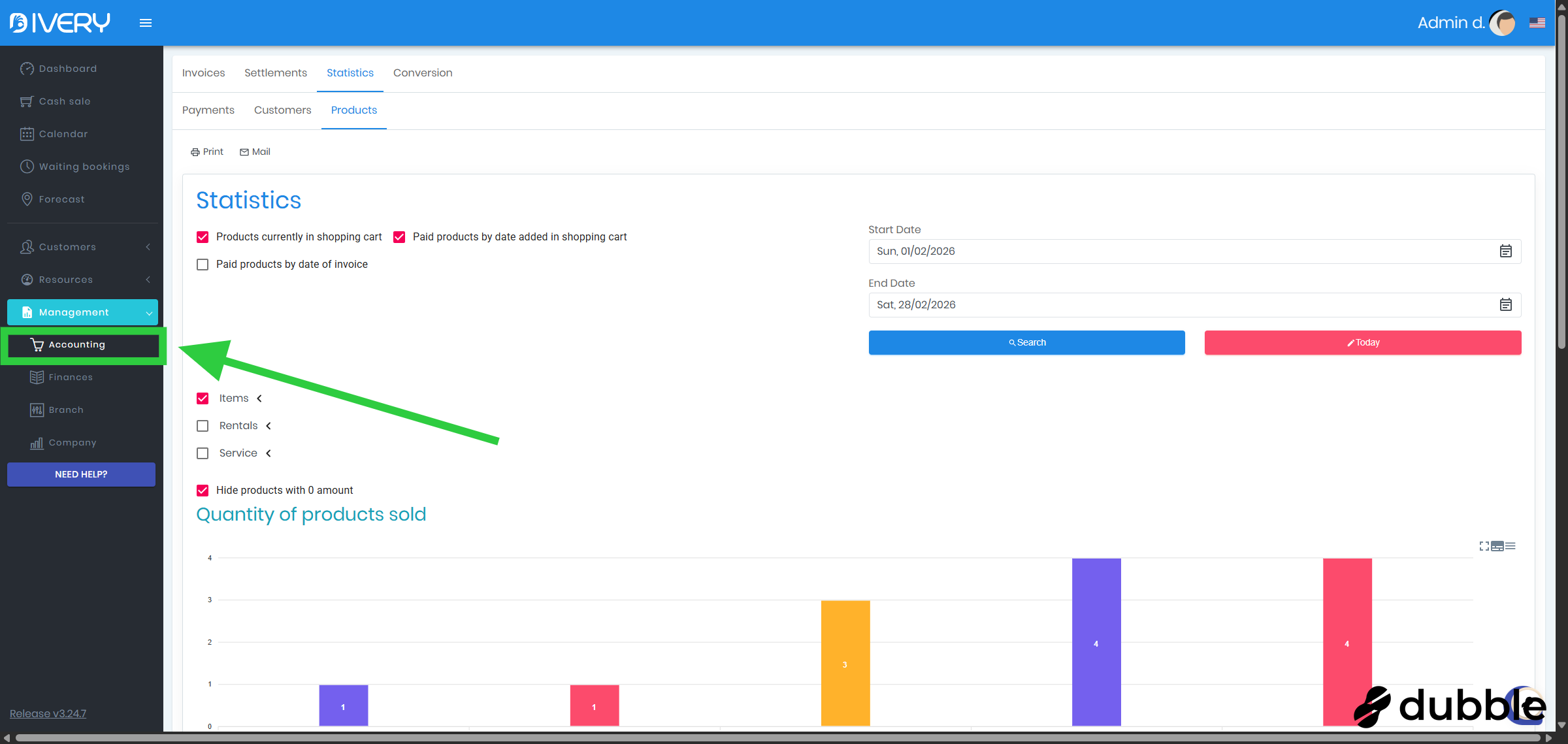 Go to the " Accounting " page by clicking on " Management " and then on " Accounting "